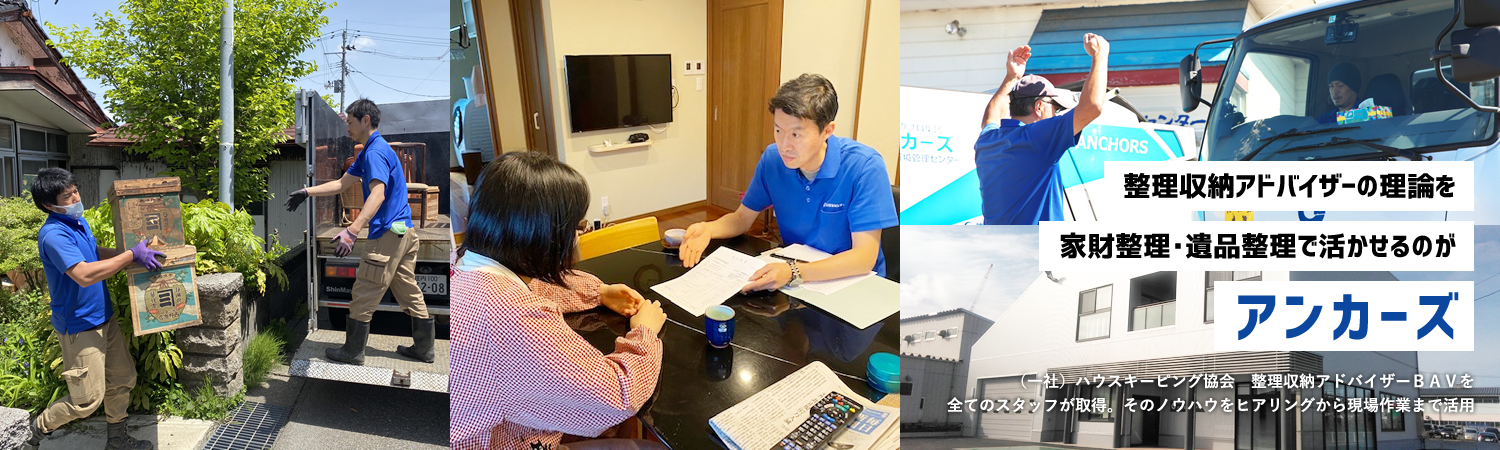 アンカーズの理念「モノは生きている」 家財整理・遺品整理・生前整理、それぞれに違いはありますが、私たちがお預かりするのは、いずれもお客様の大切な品々であることに変わりはありません。 たくさんの家財の中には、長い間忘れていたモノ、懐かしい思い出がよみがえるモノ、そして、もう一度誰かの手に渡って役立ってほしいと願うモノが眠っています。それら一つひとつに宿る記憶や想いを丁寧に受け止めながら、私たちは整理のお手伝いをしています。 アンカーズは、庄内地域で衛生事業を展開してきた株式会社環境管理センターの整理収納部門として、2013年より地域の皆さまの暮らしに寄り添ってまいりました。 私たちのサービスの根幹にあるのは、一般社団法人ハウスキーピング協会が認定する「整理収納アドバイザー」の資格に裏打ちされたスキルとマインドです。 なかでも大切にしているのが、「モノは生きている」という考え方。モノにとって心地よい居場所を見つけてあげることは、その持ち主であるお客様の心を整えることにもつながります。 | お片付けのプロ集団アンカーズ 代表 小林 秀樹 |